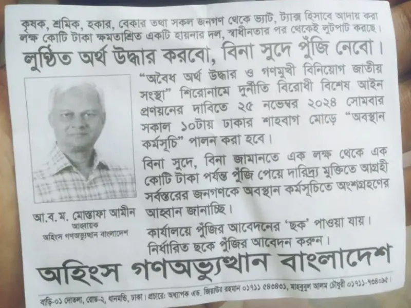 বিনা সুদে, বিনা জামানতে এক লক্ষ থেকে এক কোটি টাকা পর্যন্ত পুঁজি পেয়ে দারিদ্র্য মুক্তিতে আগ্রহী সর্বস্তরের জনগণকে অবস্থান কর্মসূচিতে অংশগ্রহণের আহ্বান জানানো হয়।