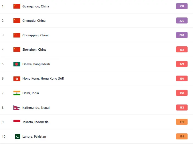 সংস্থাটি জানায়, ২৯১ স্কোর নিয়ে বায়ু দূষণের তালিকার শীর্ষে অবস্থান করছে চীনের গোয়াংজু। দ্বিতীয় ও তৃতীয় স্থানে থাকা চেংদু ও চংকুইং শহরের স্কোর যথাক্রমে ২২০ ও ২০৪। এই তিন শহরের বাতাসের মান ‘খুব অস্বাস্থ্যকর’।