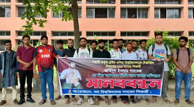 সোমবার (২১ এপ্রিল) দুপুর ২ টায় বিশ্ববিদ্যালয়ের বাদামতলায় এই মানববন্ধন কর্মসূচি অনুষ্ঠিত হয়।