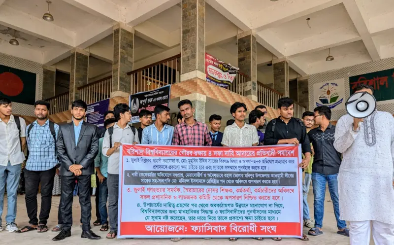 সমাবেশে ইংরেজি বিভাগের শিক্ষার্থী রাকিনের সঞ্চালনায় বক্তব্য রাখেন ইনামুল হক হৃদয়, মো. তারিক হোসেন ও আতিক আব্দুল্লাহ। তারা অভিযোগ করেন, নারী কেলেঙ্কারিতে দণ্ডপ্রাপ্ত এবং ভোলা জেলা আওয়ামী লীগের একজন নেতা মো. মনিরুল ইসলাম এখনো রেজিস্ট্রার পদে বহাল থাকলেও, শিক্ষার্থীদের পক্ষে থাকা একমাত্র শিক্ষক অধ্যাপক মুহসিন উদ্দীনকে কোনো যৌক্তিক কারণ ছাড়াই সিন্ডিকেট থেকে অব্যাহতি দেওয়া হয়েছে। শিক্ষার্থীরা এই ঘটনাকে উপাচার্যের একতরফা সিদ্ধান্ত এবং উদ্দেশ্যপ্রণোদিত বলে আখ্যা দেন।