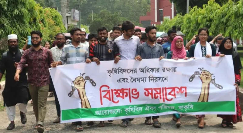 বাংলাদেশ কৃষি বিশ্ববিদ্যালয়ে (বাকৃবি) স্নাতক (বিএসসি) ডিগ্রিধারী কৃষিবিদদের অধিকার রক্ষা ও চলমান বৈষম্য নিরসনে দ্বিতীয় দিনের মতো বিক্ষোভ ও সমাবেশ করেছে বিশ্ববিদ্যালয়ের শিক্ষার্থীরা। বিক্ষোভ সমাবেশে কৃষি অনুষদের বিভিন্ন বর্ষের প্রায় তিন শতাধিক শিক্ষার্থী অংশগ্রহণ করে।