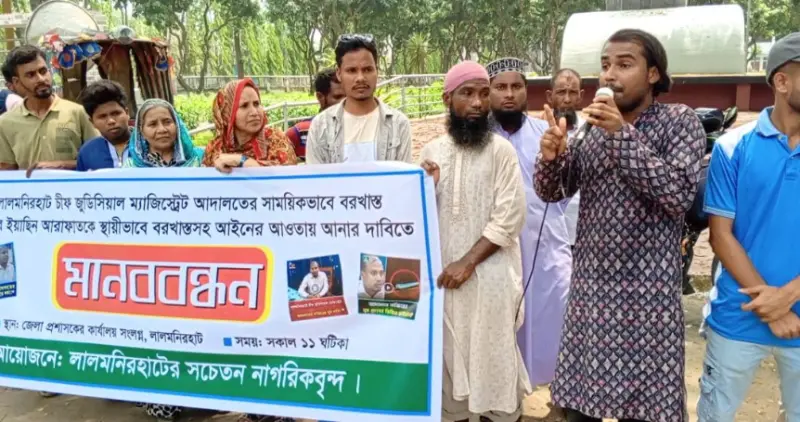 লালমনিরহাট সচেতন নাগরিক বৃন্দের ব্যানারে জেলা চীফ জুডিশিয়াল ম্যাজিস্ট্রেট আদালতের সাময়িকভাবে বরখাস্ত নাজির ইয়াসিন আরাফাতকে স্থায়ীভাবে বরখাস্তসহ আইনের আওতায় আনার দাবিতে মানববন্ধন করেছে জলার সচেতন নাগরিকবৃন্দ।