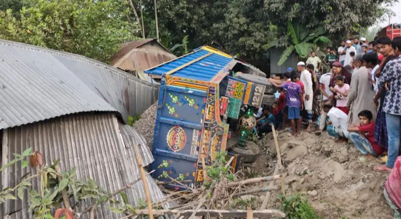 টাঙ্গাইলের ভূঞাপুরে পাথরবোঝাই একটি ট্রাক নিয়ন্ত্রণ হারিয়ে সড়কের পাশে থাকা একটি বসতঘরে ঢুকে পড়ে। দুর্ঘটনার সময় ট্রাকটি উল্টে গিয়ে ঘরে ঘুমিয়ে থাকা এক নারী চাপা পড়ে ঘটনাস্থলেই মারা গেছেন।