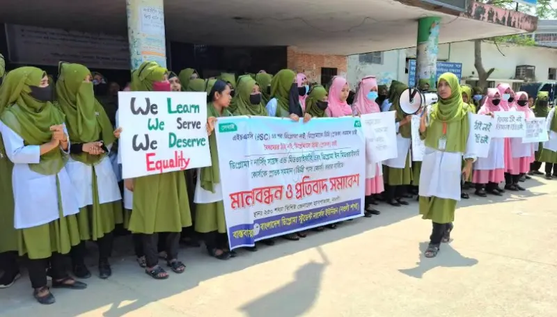 ডিপ্লোমা ইন নার্সিং সায়েন্স এন্ড মিডওয়াইফারি এবং ডিপ্লোমা ইন মিডওয়াইফারি কোর্সকে স্নাতক সমমান (ডিগ্রি পাস কোর্স) করার দাবিতে নওগাঁয় মানববন্ধন ও প্রতিবাদ সমাবেশ করেছে নার্সিং ইনস্টিটিউটের শিক্ষার্থীরা।