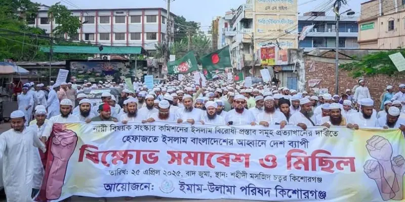 নারী বিষয়ক সংস্কার কমিশনের ইসলাম বিরোধী প্রস্তাবসমূহ প্রত্যাখ্যান করে তা বাতিলের দাবীতে কিশোরগঞ্জে বিক্ষোভ মিছিল করেছে ইমাম-উলামা পরিষদ।