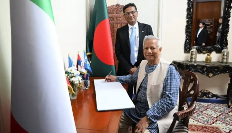 অন্তবর্তীকালীন সরকারের প্রধান উপদেষ্টা অধ্যাপক ড. মুহাম্মদ ইউনূস শুক্রবার (২৫ এপ্রিল) ইতালির রোমে অবস্থিত (বাংলাদেশ দূতাবাস) বাংলাদেশ হাউস পরিদর্শন করেছেন। এ সময় তিনি সেখানে রাখা পরিদর্শন বইয়ে স্বাক্ষর করেন।