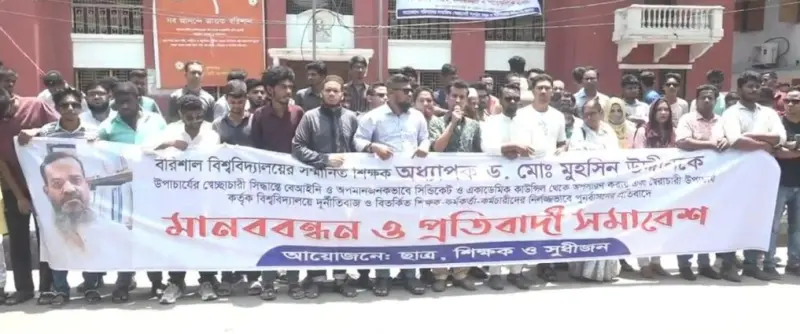 উপাচার্যের স্বেচ্ছাচারী সিদ্ধান্তে সিন্ডিকেট ও একাডেমিক কাউন্সিল থেকে বরিশাল বিশ্ববিদ্যালয়ের (ববি) শিক্ষক ড. মো. মুহসিন উদ্দীনকে অপসারণের অভিযোগ এনে উপাচার্য কর্তৃক বিশ্ববিদ্যালয়ে ফ্যাসিস্টের দোসরদের পুনর্বাসনের প্রতিবাদে মানববন্ধন ও প্রতিবাদ সমাবেশ অনুষ্ঠিত হয়েছে।