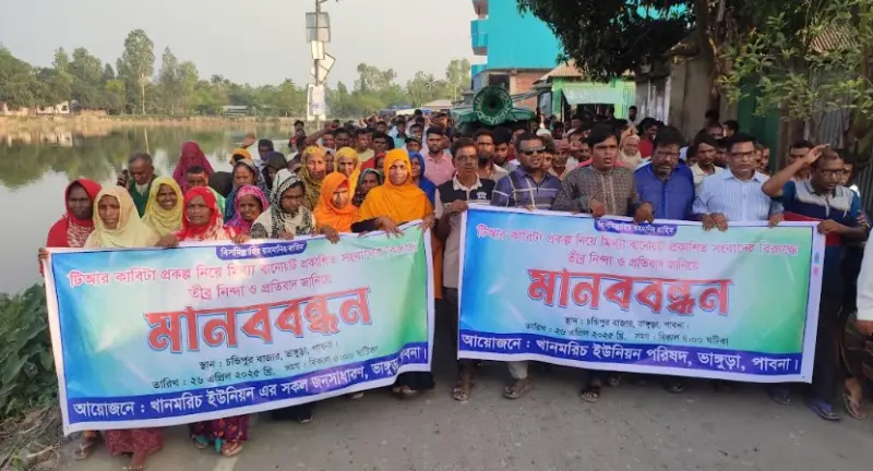 পাবনার ভাঙ্গুড়া উপজেলার খানমরিচ ইউনিয়ন পরিষদের চেয়ারম্যান মনোয়ার হোসেন মিঠুর বিরুদ্ধে অপপ্রচারের প্রতিবাদে বিক্ষোভ ও মানববন্ধন করেছেন এলাকাবাসী।