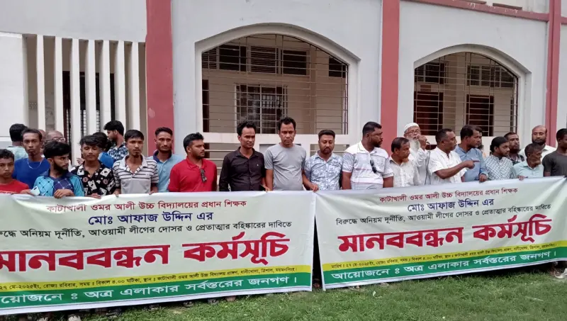 ময়মনসিংহের ত্রিশাল উপজেলার কাটাখালী উমর আলী উচ্চবিদ্যালয়ের প্রধান শিক্ষক আফাজ উদ্দিনের বিরুদ্ধে বিভিন্ন অনিয়ম-স্বেচ্ছাচারীতার অভিযোগ উঠায় তার অপসারণের দাবিতে মানববন্ধন করেছে স্থানীয় এলাকাবাসী।