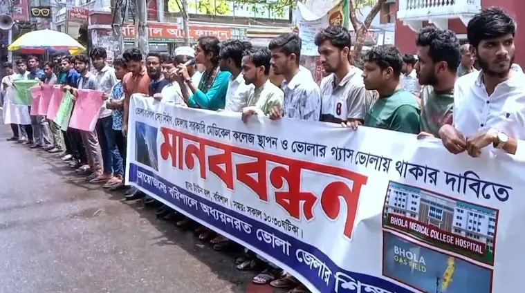 ভোলা-বরিশাল সেতু নির্মাণ, ভোলায় সরকারি মেডিকেল কলেজ স্থাপন ও ভোলার গ্যাস ভোলায় থাকার দাবিতে বরিশারৈ মানববন্ধন করেছে শিক্ষার্থীরা।