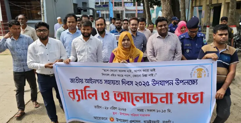 নওগাঁর ধামইরহাট উপজেলা প্রশাসনের আয়োজনে জাতীয় আইনগত সহায়তা দিবস ২০২৫ উদযাপন উপলক্ষে র্যালি ও আলোচনা সভা অনুষ্ঠিত হয়েছে।