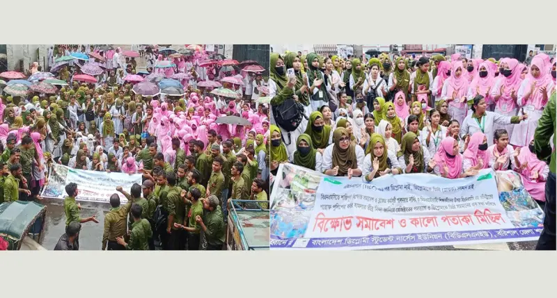 ডিপ্লোমা ইন নার্সিং সায়েন্স অ্যান্ড মিডওয়াইফারি এবং ডিপ্লোমা ইন মিডওয়াইফারি কোর্সকে স্নাতক (গ্র্যাজুয়েট) সমমানের দাবি জানিয়ে নগরীতে বিক্ষোভ ও কালো পতাকা মিছিল করেছেন শিক্ষার্থীরা।
