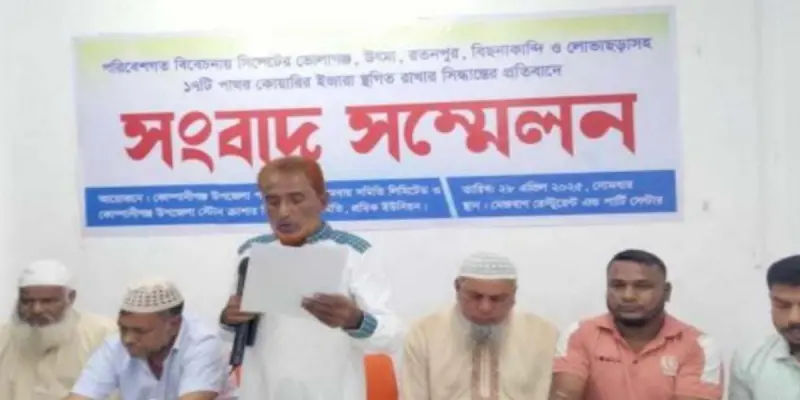 পরিবেশগত বিবেচনায় দেশের ৫১টি পাথর কোয়ারীর মধ্যে সিলেটের ৬টিসহ মোট ১৭টি পাথর কোয়ারির ইজারা স্থগিত রাখার প্রতিবাদে সোমবার (২৮ এপ্রিল) দুপুরে সিলেটের কোম্পানীগঞ্জ উপজেলার টুকের বাজার মেজবান রেষ্টুরেন্ট এন্ড পার্টি সেন্টারে সংবাদ সম্মেলনের আয়োজন করা হয়েছে ।