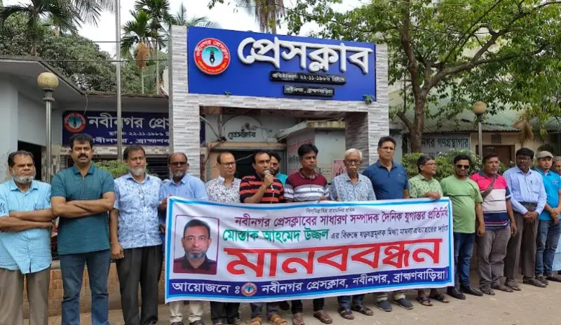 ব্রাহ্মণবাড়িয়ার নবীনগর প্রেসক্লাবের সাধারণ সম্পাদক ও দৈনিক যুগান্তরের প্রতিনিধি মোস্তাক আহমেদ উজ্বলের বিরুদ্ধে দায়ের করা মিথ্যা মামলা প্রত্যাহারের দাবিতে মানববন্ধন করা হয়।