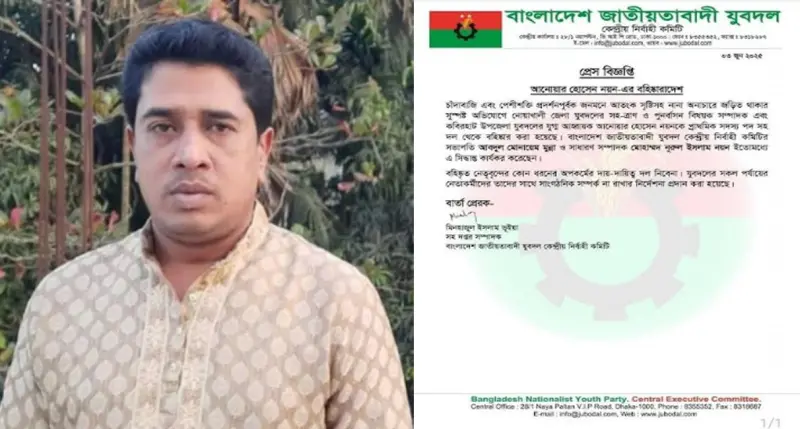 মঙ্গলবার (০৩ জুন) সকালে কেন্দ্রীয় যুবদলের প্যাডে বাংলাদেশ জাতীয়তাবাদী যুবদল কেন্দ্রীয় নির্বাহী কমিটির সহ দপ্তর সম্পাদক মিনহাজুল ইসলাম ভূইয়া স্বাক্ষরিত এক প্রেস বিজ্ঞপ্তিতে এ বহিষ্কার আদেশ দেয়া হয়।