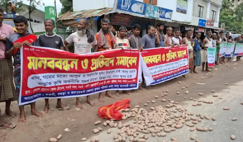 ধান-গমের মতো আলুর সরকার কর্তৃক মূল্য নির্ধারণের দাবিতে মানববন্ধন ও প্রতিবাদ সমাবেশ করেছে নওগাঁর আলু চাষিরা।