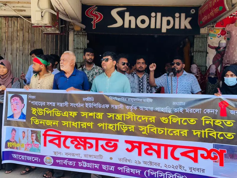 ইউপিডিএফের সশস্ত্র সন্ত্রাসীদের গুলিতে নিহত তিনজন সাধারণ পাহাড়ি যুবক হত্যার বিচারের দাবিতে বিক্ষোভ সমাবেশ অনুষ্ঠিত হয়েছে। বুধবার (২৯ অক্টোবর) সকালে শহরের বনরূপা আলিফ মার্কেটের সামনে পার্বত্য চট্টগ্রাম ছাত্র পরিষদ (পিসিসিপি) রাঙামাটি জেলা শাখার পক্ষ থেকে এ কর্মসূচির আয়োজন করা হয়।