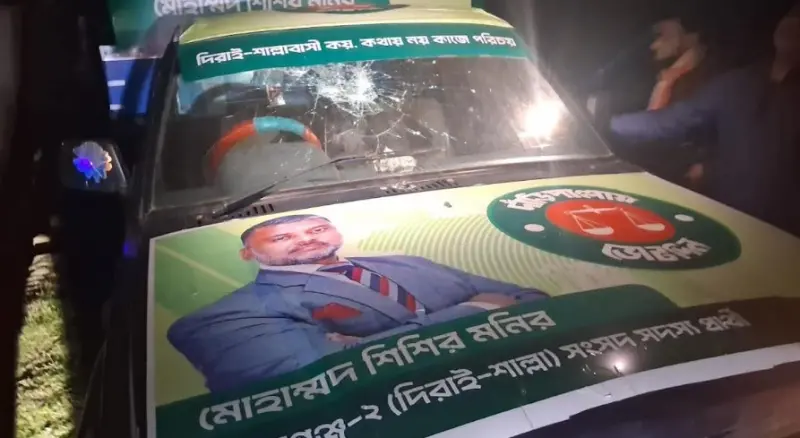 সুনামগঞ্জ ২ (দিরাই শাল্লা) আসনের জামায়াত ইসলামী মনোনীত দাঁড়িপাল্লার প্রার্থী শিশির মনিরের নির্বাচনী প্রচারের গাড়ি ভাঙচুর করেছে দুর্বৃত্তরা।