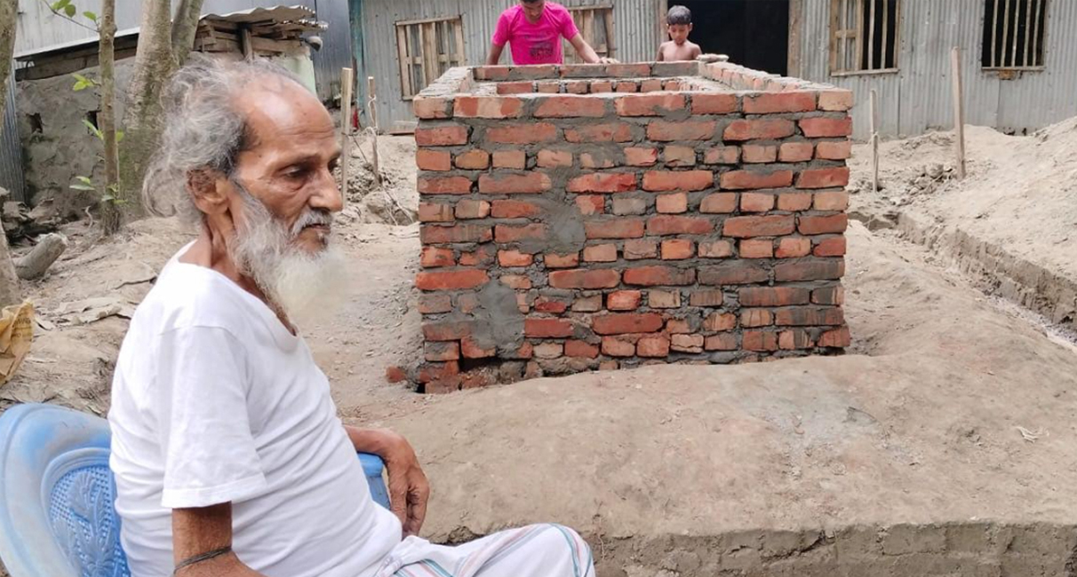 সরেজমিনে দেখা যায়, বাড়ির মধ্যে ঘরের ডান পাশে খনন করে মাটির তলদেশ থেকে ইটের গাঁথনি দিয়ে কবর তৈরি করছে রাজমিস্ত্রিরা। পাশে চেয়ারে বসে নিজের কবরের কাজ দেখভাল করছেন বৃদ্ধ হানিফ।