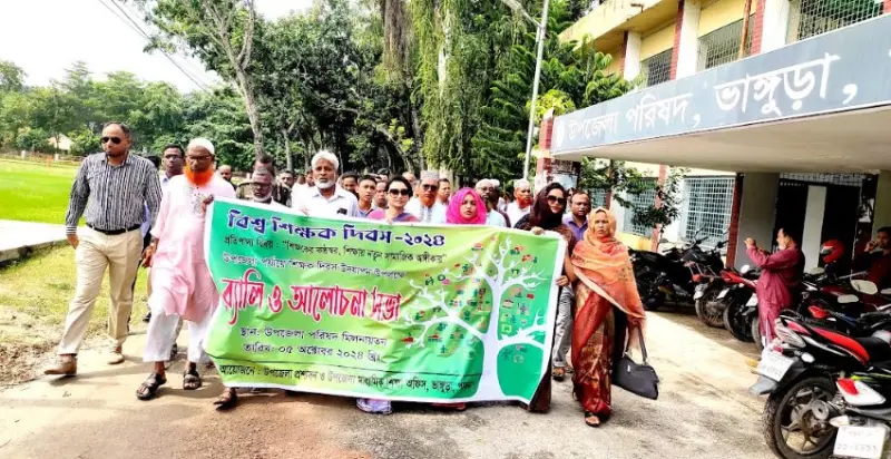 'শিক্ষকের কণ্ঠস্বর শিক্ষায় নতুন সামাজিক অঙ্গীকার' এই প্রতিপাদ্যকে সামনে রেখে পাবনার ভাঙ্গুড়ায় বিশ্ব শিক্ষক দিবস উদযাপন উপলক্ষে বর্ণাঢ্য র্যালী ও আলোচনা সভা অনুষ্ঠিত হয়েছে।