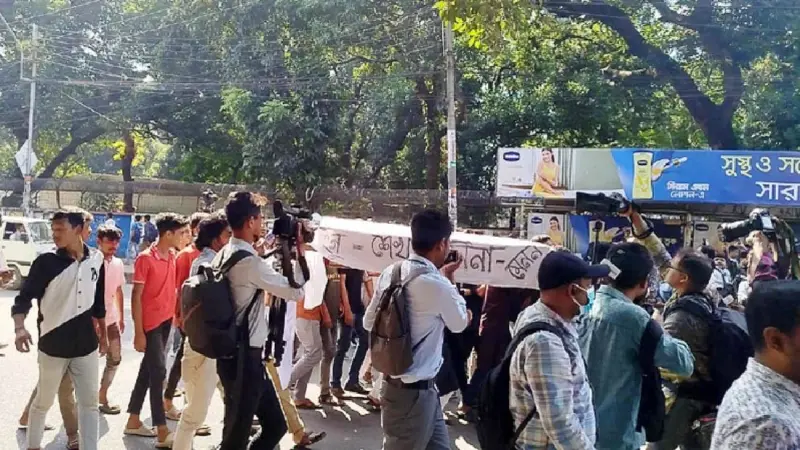 আওয়ামী লীগ, জাতীয় পার্টিসহ ফ্যাসিবাদী শক্তি ও তাদের রাজনৈতিক তৎপরতা নিষিদ্ধের দাবিতে ঢাকা বিশ্ববিদ্যালয় (ঢাবি) ক্যাম্পাসে কফিন মিছিল করেছে ‘ফ্যাসিবাদবিরোধী ছাত্র-জনতা’। বুধবার বেলা সাড়ে ১১টায় বিশ্ববিদ্যালয়ের ছাত্র-শিক্ষক কেন্দ্র (টিএসসি) থেকে ‘ফ্যাসিবাদের কফিন মিছিল’ ব্যানারে মিছিলটি কলাভবন প্রদক্ষিণ করে মধুর ক্যান্টিনের সামনে এসে শেষ হয়। মিছিলের আগে একটি সংক্ষিপ্ত সমাবেশ অনুষ্ঠিত হয়।