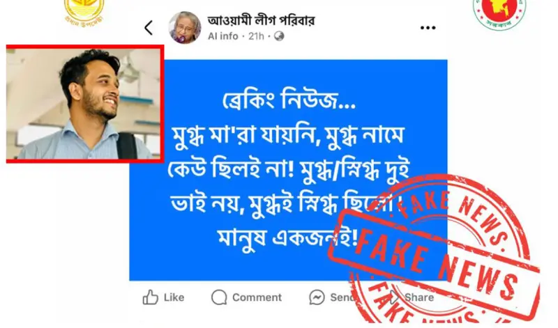 মীর মাহফুজুর রহমান মুগ্ধ জুলাই বিপ্লবের একজন বীর শহীদ। সম্প্রতি ‘মীর মুগ্ধ নামে কেউ মারা যায়নি’ কিংবা ‘মুগ্ধ ও স্নিগ্ধ একই ব্যক্তি’ দাবি করে একটি তথ্য সামাজিক যোগাযোগমাধ্যমে ছড়িয়েছে। তবে ফেসবুকে ছড়িয়ে পড়া দাবিগুলো সম্পূর্ণ মিথ্যা বলে জানিয়েছে অন্তর্বর্তী সরকারের প্রধান উপদেষ্টার প্রেস উইং।