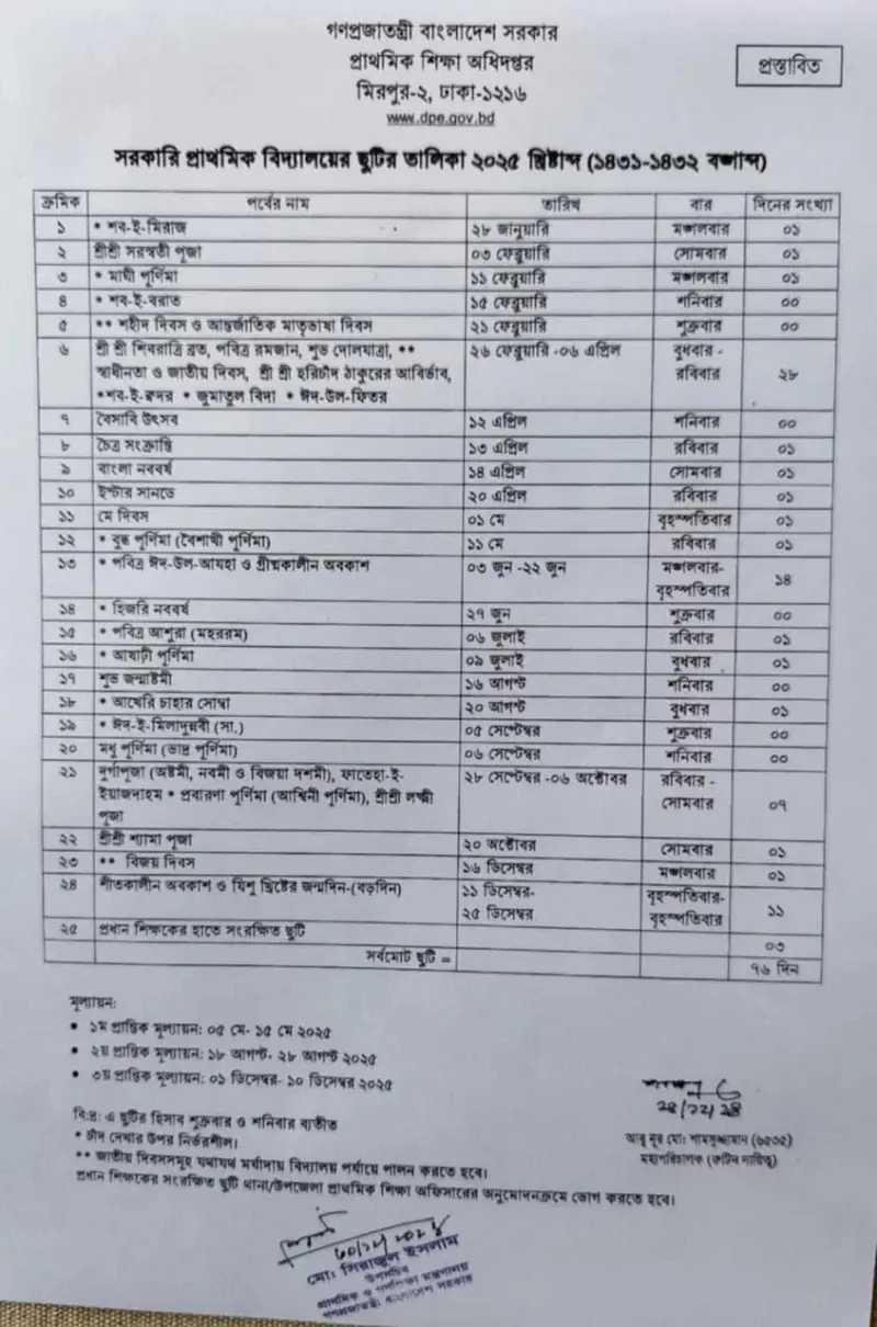 সরকারি প্রাথমিক বিদ্যালয়ের ২০২৫ সালের ছুটির তালিকা প্রকাশ করা হয়েছে। নতুন তালিকা অনুযায়ী, সাপ্তাহিক ছুটির বাইরে শিক্ষাপ্রতিষ্ঠানগুলোতে মোট ৭৬ দিন বন্ধ থাকবে। সোমবার (৩০ ডিসেম্বর) প্রাথমিক ও গণশিক্ষা মন্ত্রণালয়ের উপ সচিব মো. মিরাজুল ইসলাম স্বাক্ষরিত এক বিজ্ঞপ্তিতে এ তথ্য জানানো হয়েছে।