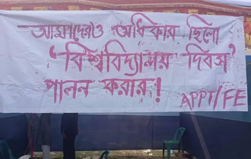 শনিবার (২৫ জানুয়ারি) বিশ্ববিদ্যালয় দিবসে বিভিন্ন বিভাগের পিঠার স্টল দেখা গেলেও এগ্রো প্রোডাক্ট প্রসেসিং টেকনোলজি (এপিপিটি), প্রস্তাবিত ফুড ইঞ্জিনিয়ারিং বিভাগের জন্য বরাদ্দকৃত স্টলে দেখা যায় একটি সাদা ব্যানারে লাল রঙের লেখায় অর্থাৎ রক্তাক্ত লেখায় 'আমাদেরও অধিকার ছিল বিশ্ববিদ্যালয় দিবস পালন করার'।