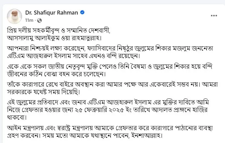 তিনি আরও লিখেন, এটি এম আজহারকে কারাগারে রেখে বাইরে অবস্থান করা আমার পক্ষে আর একেবারেই সম্ভব নয়। আমরা সরকারকে যথেষ্ট সময় দিয়েছি। এই জুলুমের প্রতিবাদে এবং জনাব এটিএম আজহারুল ইসলাম এর মুক্তির দাবিতে আমি নিজে গ্রেপ্তার হওয়ার জন্য ২৫ ফেব্রুয়ারি আদালত প্রাঙ্গণে হাজির থাকবো। আইন মন্ত্রণালয় এবং স্বরাষ্ট্র মন্ত্রণালয় আমাকে গ্রেপ্তার করে কারাগারে পাঠানোর ব্যবস্থা গ্রহণ করবেন। সময় মতো আমাকে যথাস্থানে পাবেন, ইনশাআল্লাহ।’