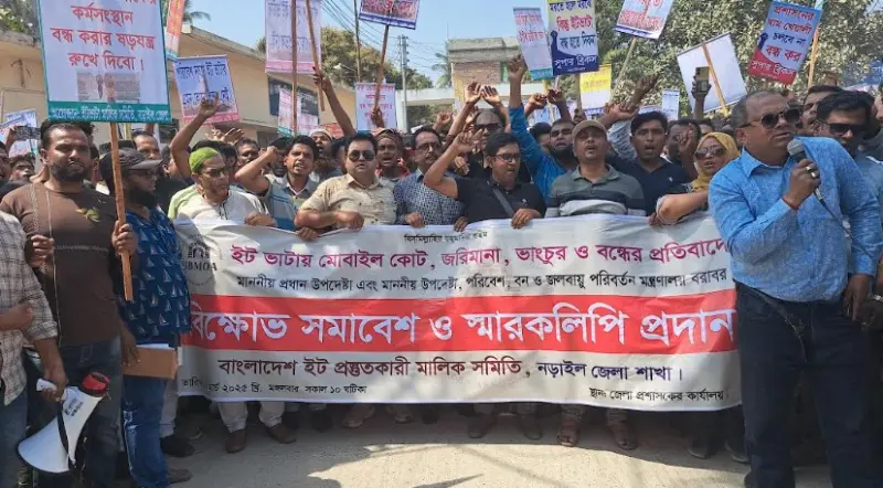 ইট ভাটায় মোবাইল কোট পরিচালনা, জরিমানা, ইটভাটা ভাঙচুর ও বন্ধের প্রতিবাদে নড়াইলে বিক্ষোভ সমাবেশ ও স্মারকলিপি প্রদান করা হয়েছে। বাংলাদেশ ইট প্রস্তুতকারী মালিক সমিতি নড়াইল জেলা শাখার আয়োজনে আজ মঙ্গলবার (০৪ মার্চ) নড়াইল শিল্পকলা একাডেমি চত্বরে এ বিক্ষোভ সমাবেশ অনুষ্ঠিত হয়।
