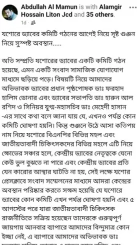 বিষয়টি নিয়ে আমাদের অভিভাবক ড্যাবের প্রধান পৃষ্ঠপোষক ডা. ফরহাদ হালিম ডোনার এবং ড্যাবের সভাপতি ডা. হারুন আল রশিদ ও সিনিয়র যুগ্ম-মহাসচিব ডা. মেহেদী হাসান -এর সাথে কথা বলে জানা যায় যে, এখনও পর্যন্ত কোন কমিটি ঘোষণা হয়নি। কিন্তু গুঞ্জনে উঠে আসা কতিপয় নাম নিয়ে যশোরে বিএনপির বিভিন্ন মহল এবং জাতীয়তাবাদী চিকিৎসকদের বিভিন্ন মহলে এটি নিয়ে ক্ষোভের সঞ্চার হলে, কেন্দ্রীয় ড্যাবের নেতৃত্বকে যেনো কেউ ভুল বুঝতে না পারে এবং কেন্দ্রীয় ড্যাবের প্রতি যেন কারোর আস্থার ঘাটতি না হয়, সেই লক্ষে যশোর প্রেসক্লাবে সংবাদ সম্মেলনের মাধ্যমে আমরা কেন্দ্রের অবস্থান পরিষ্কার করতে সক্ষম হয়েছি যে যশোরে ড্যাবের কোন কমিটি এখন পর্যন্ত ঘোষণা হয়নি এবং ৫ আগস্টের পরে যারা জাতীয়তাবাদী চিকিৎসক রাজনীতিতে সক্রিয় হয়েছেন তাদেরকে গুরুত্বপূর্ণ জায়গায় আনবার ব্যাপারে আমাদের বিন্দুমাত্র কোন ইচ্ছা নেই।