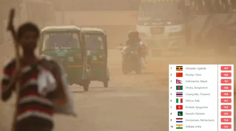 সূচক অনুযায়ী ঢাকার মতো উগান্ডার কাম্পালা, চীনের বেইজিং, নেপালের কাঠমান্ডু ও থাইল্যান্ডের চিয়াং মাই এর বাতাস ‘অস্বাস্থ্যকর’ পর্যায়ে রয়েছে।