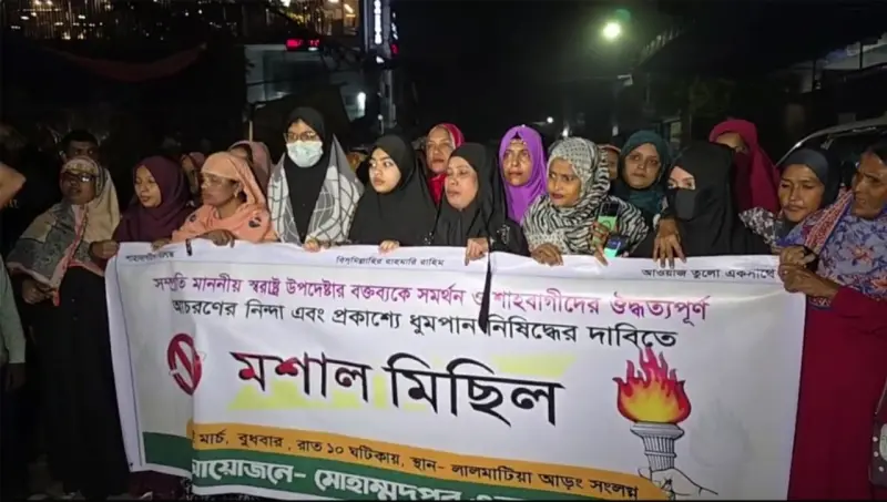 মিছিলে অংশ নেওয়া নারীরা বলেন, ধুমপানের কারণে নানাবিধ ক্ষতি হচ্ছে। প্রকাশ্যে ধুমপান শিশুসহ অধুমপায়ীদের বেশি ক্ষতি করছে। আমরা সরকারের কাছে দাবি জানাই সারা দেশে ধুমপান ও মাদক নিষিদ্ধ করা হোক।