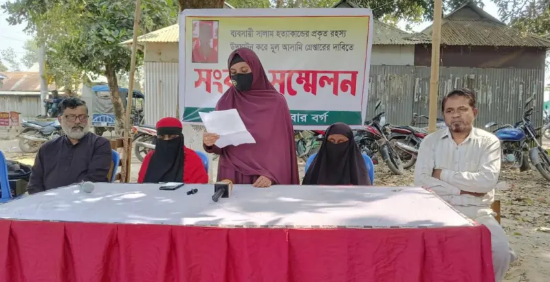 সংবাদ সম্মেলনে লিখিত বক্তব্য পাঠ করেন নিহতের মেয়ে ফাতেমা আক্তার। এ সময় এক পাশে নিহতের স্ত্রী বাছাতন বেগম অপর পাশে নিহতের মা সালেহা বেগম কান্না করছিলেন।