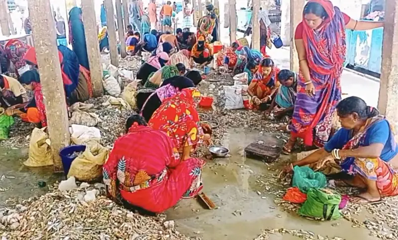 জীবন যুদ্ধে বেঁচে থাকার জন্য দেশের দ্বিতীয় বৃহত্তম মৎস্য অবতরণ কেন্দ্র পাথরঘাটায় চিংড়ির অবশিষ্ট অংশের বিনিময়ে হাজারো নারী মাছ বাছাইয়ের কাজ করছে । ভোরের আলো ফোটার আগে থেকে শুরু করে সন্ধ্যা পর্যন্ত চলে মাছ বাছাই কাজ। জেলে পল্লীতে গিয়ে দেখা গেছে বিভিন্ন রকম মাছ বাছাই করে প্যাকেটের জন্য নারীদের মজুরি দেওয়া হচ্ছে মাছের অবশিষ্ট অংশ চিংড়ির মাথা। কখনো কখনো দেওয়া হয় কেজি প্রতি ১২ থেকে ১৫ টাকা করে। প্রতিদিন মোট ৮ থেকে ১০ ঘন্টা শ্রম দিয়ে পাচ্ছে তারা ১৫০ থেকে ২০০ টাকা। নারীরা পাচ্ছেনা তাদের শ্রমের সঠিক মূল্যায়ন। এই অল্প মজুরির টাকা দিয়ে সংসারের হাল ধরতে হচ্ছে এই নারীদের।