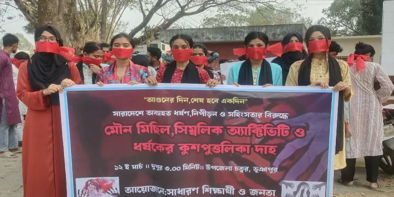 সারাদেশে চলমান ধর্ষণ নিপীড়ন ও সহিংসতার বিরুদ্ধে টাঙ্গাইলের ভূঞাপুরে মৌন মিছিল করেছে সাধারন শিক্ষার্থীরা। এ সময় তাঁরা ধর্ষকের কুশপুত্তলিকা দাহ করেন।