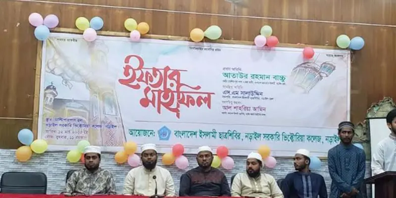 বাংলাদেশ ইসলামী ছাত্রশিবির নড়াইল ভিক্টোরিয়া কলেজ শাখার সভাপতি আল শাহরিয়া আমিনের সভাপতিত্বে ইফতার মাহফিলে প্রধান অতিথি হিসাবে উপস্থিত ছিলেন নড়াইল জেলা জামায়াতে আমির আতাউর রহমান বাচ্চু, বিশেষ অতিথি হিসাবে উপস্থিত ছিলেন নড়াইল প্রেসক্লাবের সদস্য সচিব এম এম মাহবুবুর রশিদ লাবলু, জেলা ছাত্রশিবিরের সভাপতি সালাউদ্দিন।