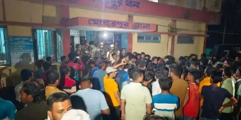 মেহেরপুরে ধর্ষণ মামলার তদন্ত অফিসারের সহযোগীতায় আসামিরা জামিনে ছাড়া পেয়ে বাদীকে হত্যার হুমকী দেওয়া ও বৈষম্য বিরোধী ছাত্র আন্দোলনের ছাত্রকে মারধর করার অপরাধে আসামিদের গ্রেফতার ও তদন্ত অফিসারের শাস্তির দাবীতে মেহেরপুর সদর থানা ঘেরাও করেছে বৈষম্য বিরোধী ছাত্র আন্দোলন ও জাতীয় নাগরিক কমিটির নেতৃবৃন্দ।