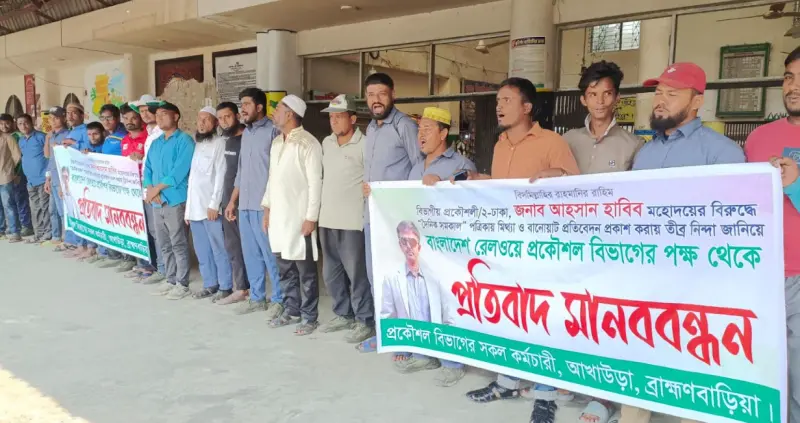 বাংলাদেশ রেলওয়ের ঢাকা বিভাগীয় প্রকৌশলী/২ আহসান হাবীবের বিরুদ্ধে একটি জাতীয় দৈনিক পত্রিকায় প্রকাশিত সংবাদের প্রতিবাদ জানিয়ে মানববন্ধন ও প্রতিবাদ সমাবেশ করেছে ব্রাহ্মণবাড়িয়ার আখাউড়া রেলওয়ে জংশন প্রকৌশল বিভাগের সকল কর্মচারী। মঙ্গলবার দুপুর দুইটার দিকে আখাউড়া রেলওয়ে জংশনের ১নং প্লাটফর্মে এ মানববন্ধন ও প্রতিবাদ সমাবেশ অনুষ্ঠিত হয়।