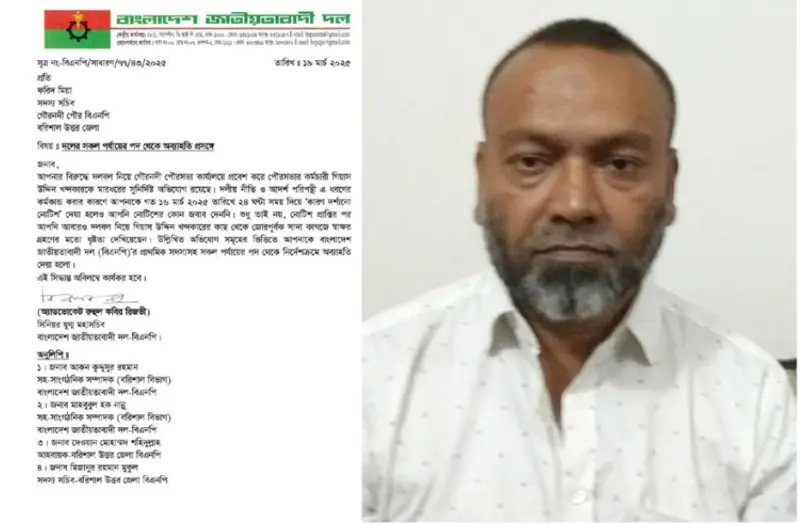 ওই বিবৃতিতে উল্লেখ করা হয়, আপনার বিরুদ্ধে দলবল নিয়ে গৌরনদী পৌরসভা কার্যালয়ে প্রবেশ করে পৌরসভার কর্মচারী গিয়াস উদ্দিন খন্দকারকে মারধরের সুনির্দিষ্ট অভিযোগ রয়েছে। দলীয় নীতি ও আদর্শ পরিপন্থী এ ধরণের কর্মকান্ড করার কারণে আপনাকে গত ১৬ মার্চ ২০২৫ তারিখে ২৪ ঘন্টা সময় দিয়ে ‘কারণ দর্শানো নোটিশ’ দেয়া হলেও আপনি নোটিশের কোন জবাব দেননি।