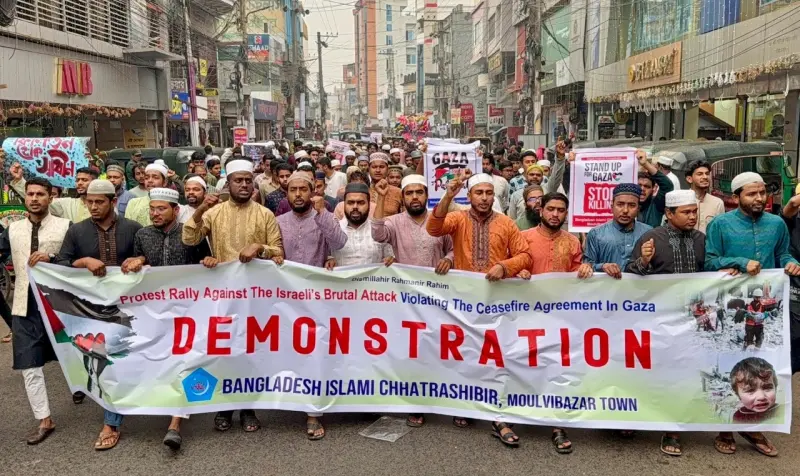 শান্তিচুক্তি লঙ্ঘন করে ফিলিস্তিনে ইসরায়েলি নৃশংস গণহত্যা ও বর্বরোচিত হামলার প্রতিবাদে বিক্ষোভ মিছিল পালন করেছে বাংলাদেশ ইসলামী ছাত্রশিবির মৌলভীবাজার শহর শাখা।