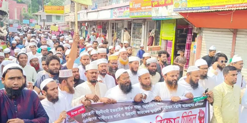 শুক্রবার (২১ মার্চ) দুপুর ২টার দিকে উপজেলার বিভিন্ন প্রান্ত থেকে মুসল্লীরা খন্ড খন্ড মিছিল নিয়ে কেন্দ্রীয় মসজিদের সামনে এসে মিলিত হয়। পরে ‘নারায়ে তাকবীর, আল্লাহু আকবার’ স্লোগানে বিশাল এক বিক্ষোভ মিছিল বের হয়।