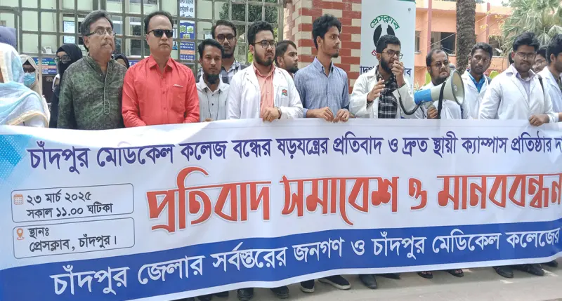 চাঁদপুর মেডিকেল কলেজ বন্ধের ষড়যন্ত্রের প্রতিবাদ ও স্থায়ী ক্যাম্পাস প্রতিষ্ঠার দাবিতে মানববন্ধন ও প্রতিবাদ সমাবেশ অনুষ্ঠিত হয়েছে। রবিবার (২৩ মার্চ) দুপুরে চাঁদপুর প্রেসক্লাবের সামনে চাঁদপুর জেলার সর্বস্তরের জনগণ ও চাঁদপুর মেডিকেল কলেজের শিক্ষার্থীদের আয়োজনে এই সমাবেশ হয়।