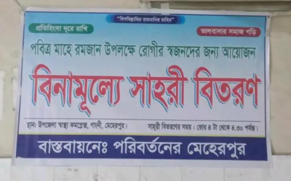 মেহেরপুরের গাংগী উপজেলা স্বাস্থ্য কমপ্লেক্সের রোগী ও তাদের স্বজনদের প্রতিদিন সাহরি খাওয়ার ব্যবস্থা করে প্রশংসায় ভাসছেন ফেসবুক প্ল্যাটফর্ম গ্রুপ পরিবর্তনের মেহেরপুরের আয়োজকরা। এমন উদ্যোগকে স্বাগত জানিয়েছেন উপজেলার সর্বস্তরের জনসাধারণ।
