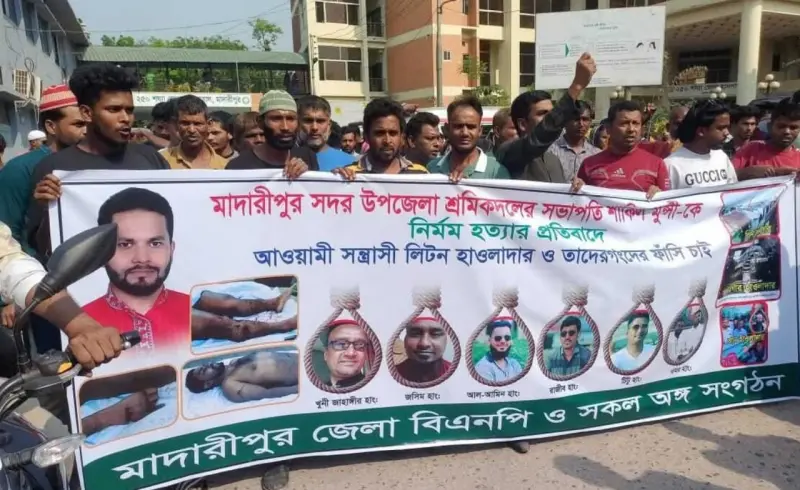 মাদারীপুরে নিহত সদর উপজেলার শ্রমিকদল নেতা শাকিল মুন্সির লাশ নিয়ে বিক্ষোভ করেছেন স্বজন। এ সময় সদর থানার ভারপ্রাপ্ত কর্মকর্তার পদত্যাগ দাবি করেছেন স্বজন ও এলাকাবাসী। পাশাপাশি হত্যাকান্ডে জড়িতদের বিচার দাবি করেন তারা।