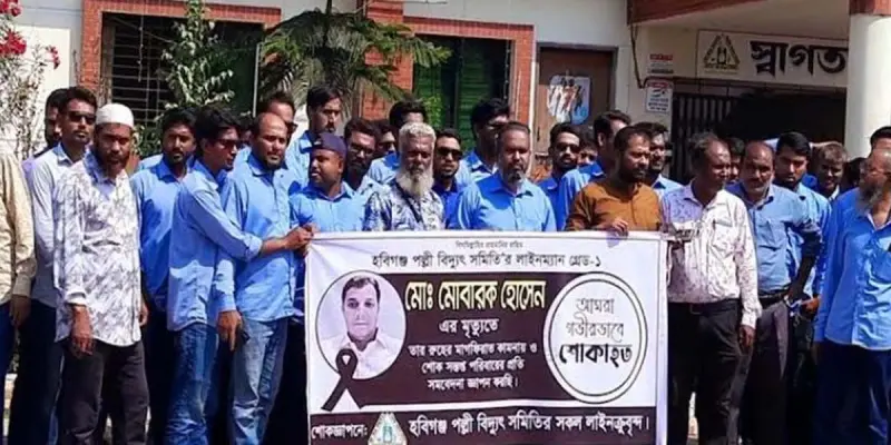 হবিগঞ্জ শায়েস্তাগঞ্জে বিদ্যুৎ লাইন মেরামত করতে গিয়ে আহত লাইনম্যান মোবারক হোসেনের মৃত্যুতে কর্মবিরতি ও মানববন্ধন অনুষ্ঠিত হয়েছে।