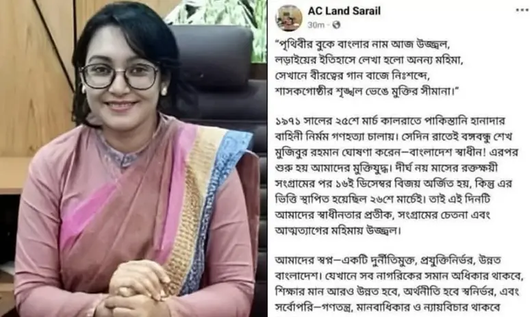 শেখ মুজিবুর রহমানকে স্বাধীনতার ঘোষক দাবি করায় ব্রাহ্মণবাড়িয়ার সরাইল উপজেলা সহকারী কমিশনার (ভূমি) সিরাজুম মুনিরা কায়ছানকে প্রত্যাহার করা হয়েছে।