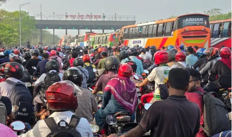 পদ্মা সেতুর সাইট অফিসের নির্বাহী প্রকৌশলী আবু সাঈদ বলেন, গতকাল বৃহস্পতিবার রাত থেকে পদ্মা সেতু পাড়ি দেওয়া যানবাহনের সংখ্যা বাড়তে থাকে। তবে যানবাহনের কোনো জটলা বাঁধেনি। আজ ভোর চারটা পর্যন্ত টোল প্লাজায় কোনো যানবাহন অপেক্ষমাণ ছিল না। সকাল ছয়টার পর থেকে যানবাহনের চাপ হঠাৎ বৃদ্ধি পায়। এর মধ্যে মোটরসাইকেলের সংখ্যাই বেশি। সকাল পৌনে ৯টার দিকে পদ্মা সেতুর টোল প্লাজা থেকে উত্তর থানা পর্যন্ত প্রায় এক কিলোমিটার এলাকায় যানবাহন অপেক্ষমাণ ছিল।