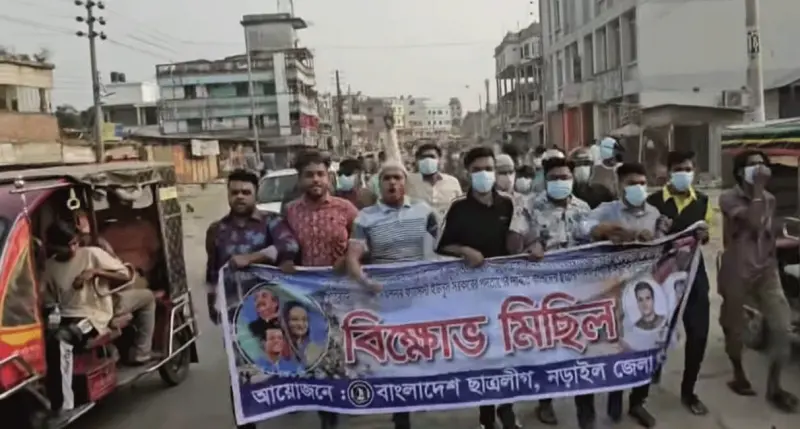 প্রত্যক্ষদর্শীরা জানান, মঙ্গলবার (১ এপ্রিল) সকাল ১০টার দিকে নড়াইল শহরের রূপগঞ্জ এলাকায় নড়াইল জেলা ছাত্রলীগের ব্যানারে ২৫-৩০ জনের একটি গ্রুপ অন্তবর্তী সরকারের বিরুদ্ধে স্লোগান দিয়ে মিছিল করে। এ সময় তাদের অধিকাংশের মুখে মাক্স এবং কয়েকজনের হেলমেট পরা ছিল।
