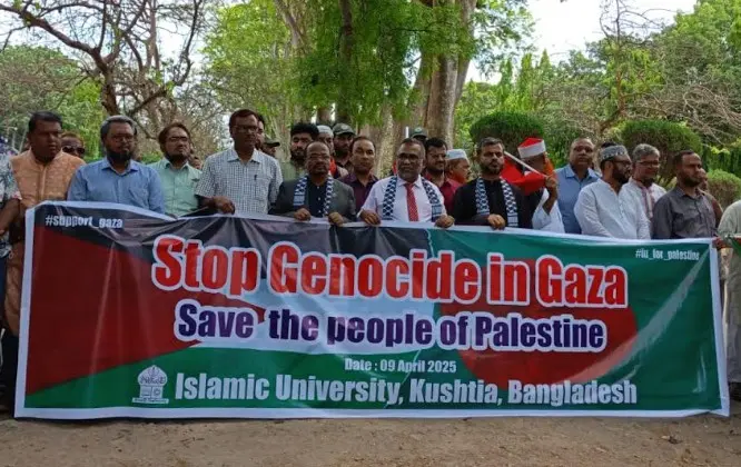গাজা শহরে দখলদার ইসরায়েল বাহিনী কতৃক চলমান নৃশংস হামলা ও বর্বরোচিত হত্যাযজ্ঞের প্রতিবাদ জানিয়ে বুধবার (৯ এপ্রিল) দুপুর ১২টায় বিশ্ববিদ্যালয় প্রশাসন কতৃক আয়োজিত একঘন্টার শাটডাউন কর্মসূচিতে উপাচার্য এসব কথা বলেন। এসময় ইসরায়েল বাহিনীর প্রতি তীব্র নিন্দা এবং ফিলিস্তিনিদের মুক্তি চেয়ে সৃষ্টিকর্তার নিকট প্রার্থনা করা হয়।